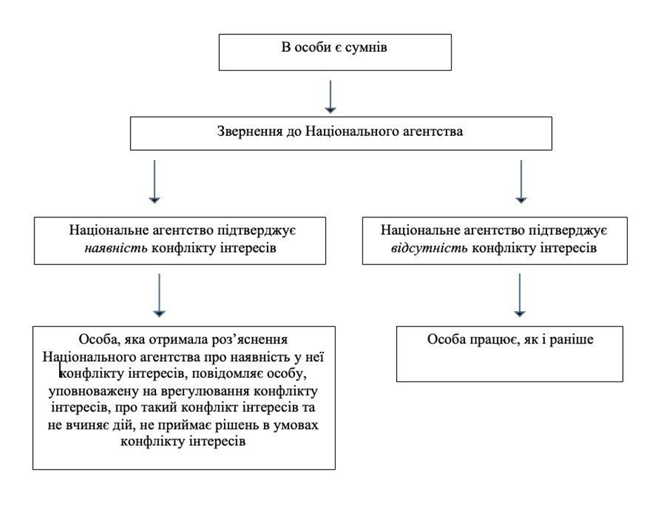 Звернення особи до Національного агентства для отримання такого роз’яснення має передувати вчиненню нею дій, прийняттю рішень в ситуації, у якій у неї існує сумнів щодо наявності конфлікту інтересів.