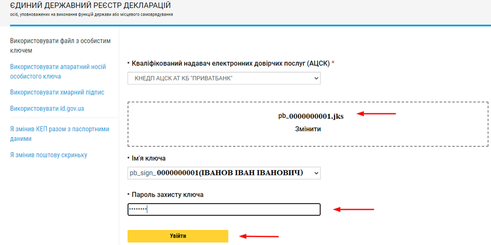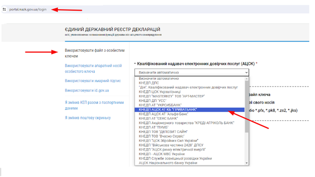 Для входу в Реєстр після реєстрації необхідно обрати КНЕДП, що видав вам КЕП, завантажити на стартовій сторінці Реєстру https://portal.nazk.gov.ua/login ваш КЕП , ввести пароль до Вашого КЕП, який ви створили при його отриманні та натиснути кнопку «Увійти». Після цього ви зможете створити новий документ та подати декларацію чи інший документ.