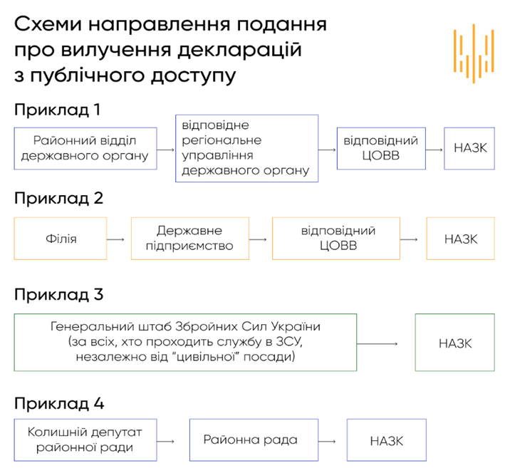 Увага! Подання про вилучення декларацій з Реєстру залишається без розгляду НАЗК у разі підписання його особою, яка не мала права його підписувати (не є суб’єктом подання), а також у разі, якщо до подання не долучено копію наказу про уповноваження заступника керівника органу на підписання подання (у разі підписання подання заступником керівника).