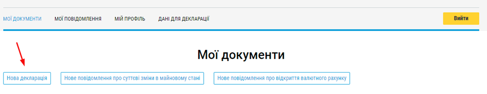 Для цього в розділі «Мої документи» необхідно натиснути на одну з кнопок – «Нова декларація», «Нове повідомлення про суттєві зміни в майновому стані», «Нове повідомлення про відкриття валютного рахунку» в залежності від того, який саме документ вам необхідно подати. Після цього має відкритися вікно для заповнення документа. У першому кроці декларації необхідно обрати потрібний вам тип декларації.